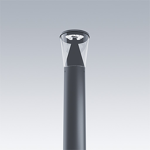 Lanterne poteau discrète avec 18, LED alimentées avec 500mA et distribution lumineuse de type Confort symétrique radial. Flux fixe Driver. Classe électrique I, IP66, IK10. Base : aluminium Moulage sous pression (EN AC-44300). Finition : aluminium thermopoudré, gris anthracite 900 sablé texturé. Diffuseur : Polycarbonate (PC) transparent stabilisé aux UV. Pré-câblé avec 3 m de câble.. Mât à commander séparément.
