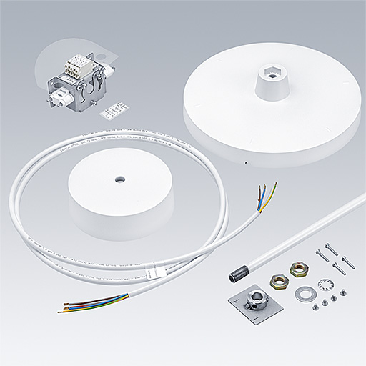 Suspension sur tige pour la gamme de produits NOVALINE Style. Accessoire pour taille M / L, consistant en un mât blanc de 1.000 mm de long, borne de raccordement, plaque de retenue avec couvercle blanc, rosace de plafond en plastique blanc et câble d’alimentation.