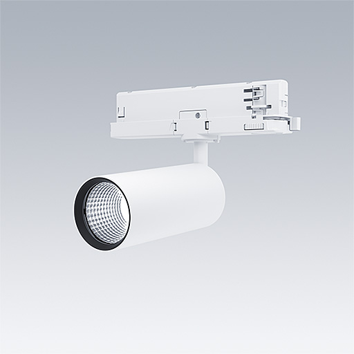 Projecteur LED pour installation sur rail triphasé avec distribution lumineuse de type projection large et température de couleur stabilisée. Electronique, non gradable. Classe électrique II, IP20. Corps : aluminium Moulage sous pression, peinture microtexturée blanc. Réflecteur : PC poudré. Projecteur orientable sur le plan horizontal de 360° et inclinable sur le plan vertical de 90°. Livré avec LED 4 000 K